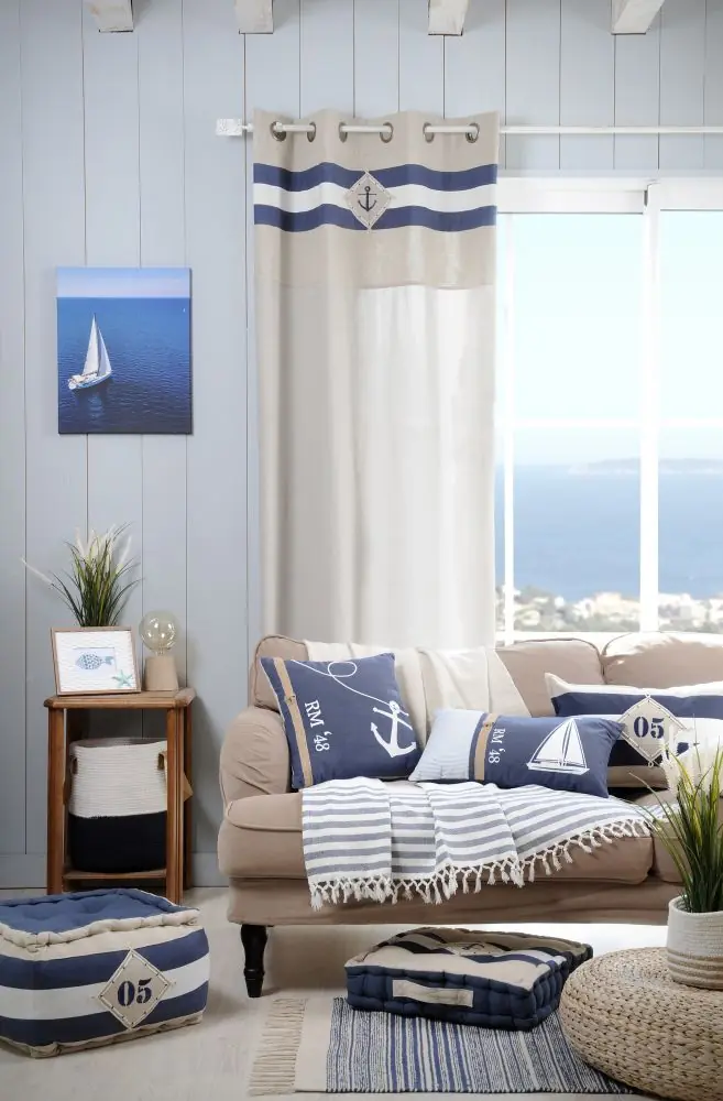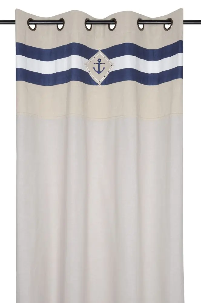 Draperie marinărească cu colace compoziție 100% bumbac, este compusă din două părți – partea superioară are un model dungi orizontale cu două dungi albastre și o dungă albă iar central se află o ancoră albastră; partea inferioară este uni având culoare grej. Designul cu specific oceanic al acestei draperii fac acest produs unul foarte potrivit pentru case decorate în stilul exotic, marinăresc. Colecția Olonne este o colecție cu motiv mediteranean ce conține articolele precum: pernă decorativă dreptunghiulară, perdea cu angore, perne scaun, puf podea, pernă canapea, pernă podea etc.