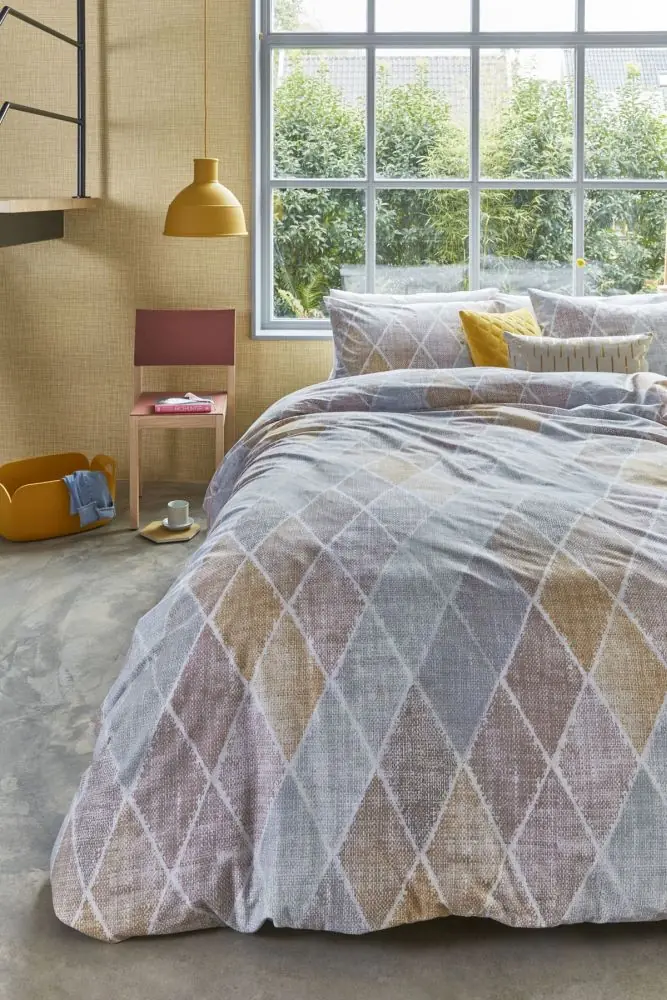 Lenjerie pat romburi galbene model Castillo Yellow este o lenjerie de pat cu compozițțe 100% bumbac. Modelul acestei lenjerii de pat este unul modern și simetric și redă o multitudine de romburi pe diferite culori precum galben, bej, gri și grej, romburi ce sunt delimitate de dungi albe discrete. Densitatea mare a fibrei de bumbac pur (peste 200 TC) a aceastei lenjerii de pat conferă o senzație foarte plăcută corpului în timpul somnului, iar prin calitatea “breathable” a bumbacului aerul circulă prin fibră aerisind astfel corpul pe perioada odihnei.