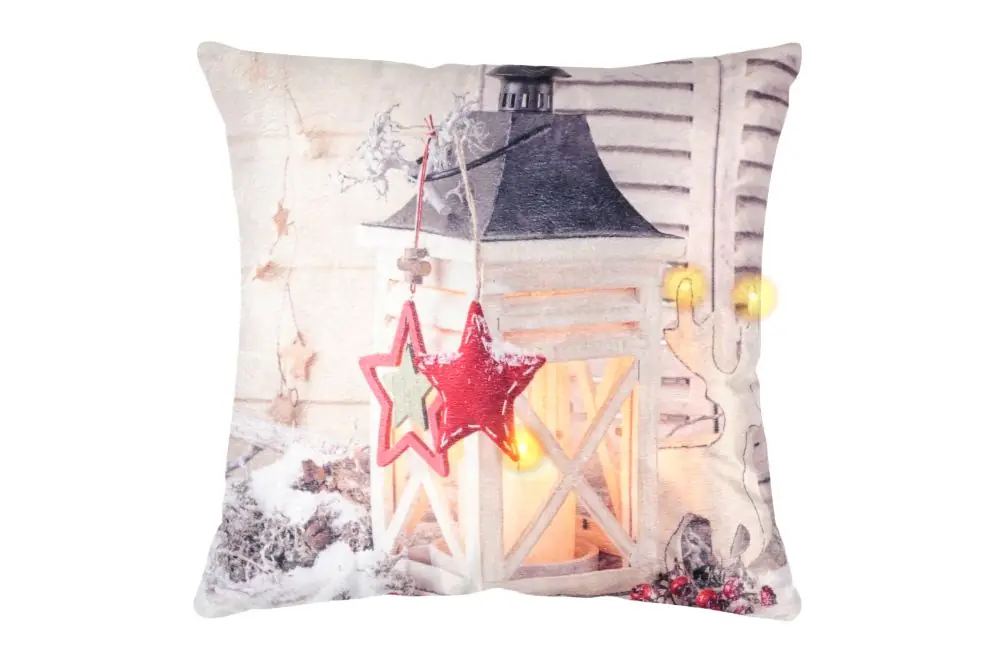 Pernă decorativa Craciun cu led Jinglebells are compoziție 100% poliester și dimensiunea de 45×45 cm. Aceasta este o pernă decorativă este cu totul deosebită datorită luminițelor LED și este cadoul ideal de Crăciun pentru persoanele dragi. Modelul acestei perne decorative are în prim plan un felinar alb într-un decor de Crăciun, ce ne duce cu gândul la minunatele Sărbători de iarnă și la peisajul de nea. Colecția din care această pernă face parte se numește Jinglebells iar această colecție conține: opritor de ușă în formă de moș Crăciun, perne decorative cu led, pernă decorative cu moș Crăciun etc. Compoziția de foarte bună calitate combinată cu finisările de înaltă calitate fac acest produs unul durabil și excepțional.